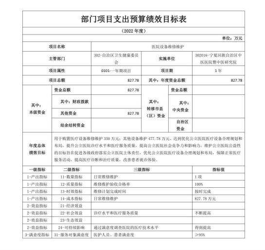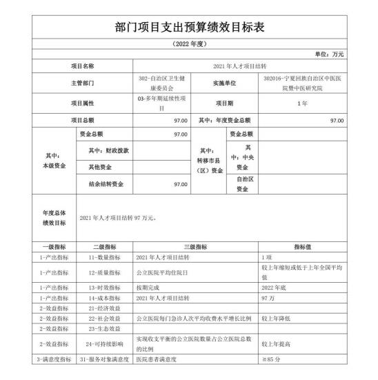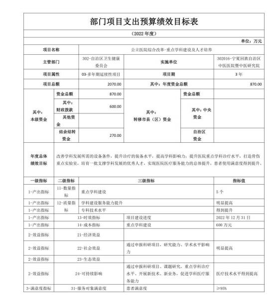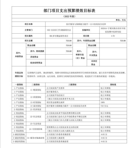 宁夏回族自治区中医医院暨中医研究院2022年自治区本级部门项目支出预算绩效目标