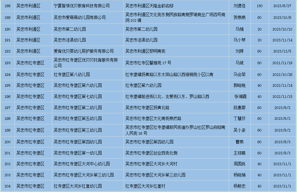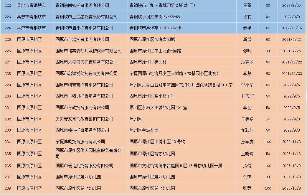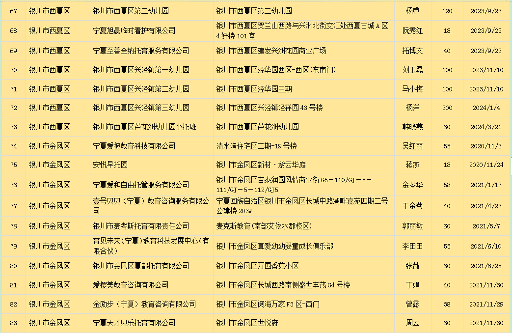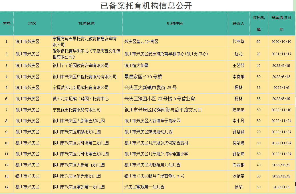为加强托育机构管理,根据《自治区健康宁夏建设领导小组关于促进3岁以下婴幼儿照护服务发展的实施意见》(宁健组发〔2020〕3号)、《关于印发宁夏回族自治区托育机构登记和备案实施细则(试行)的通知》(宁卫规发〔2022〕2号)要求,宁夏回族自治区实行3岁以下婴幼儿托育机构备案管理制度,现将机构名单及主要信息面向社会公开。
