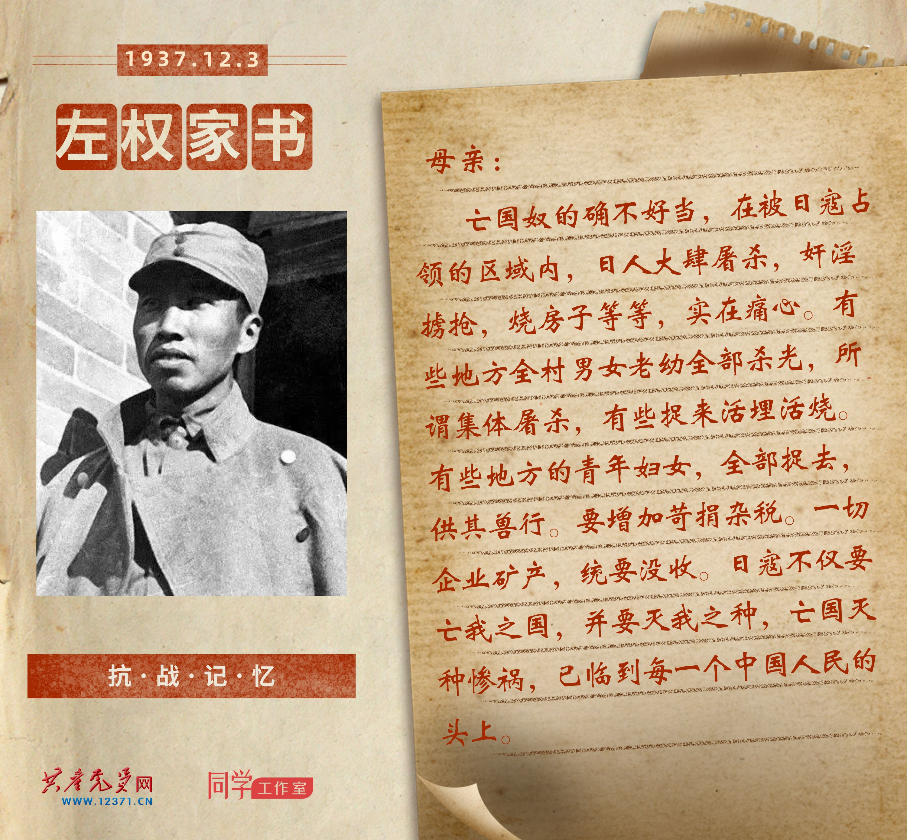 这是左权1937年12月3日写给母亲张氏的一封信,表达了自己抗击日本帝国主义侵略者的决心和信心。