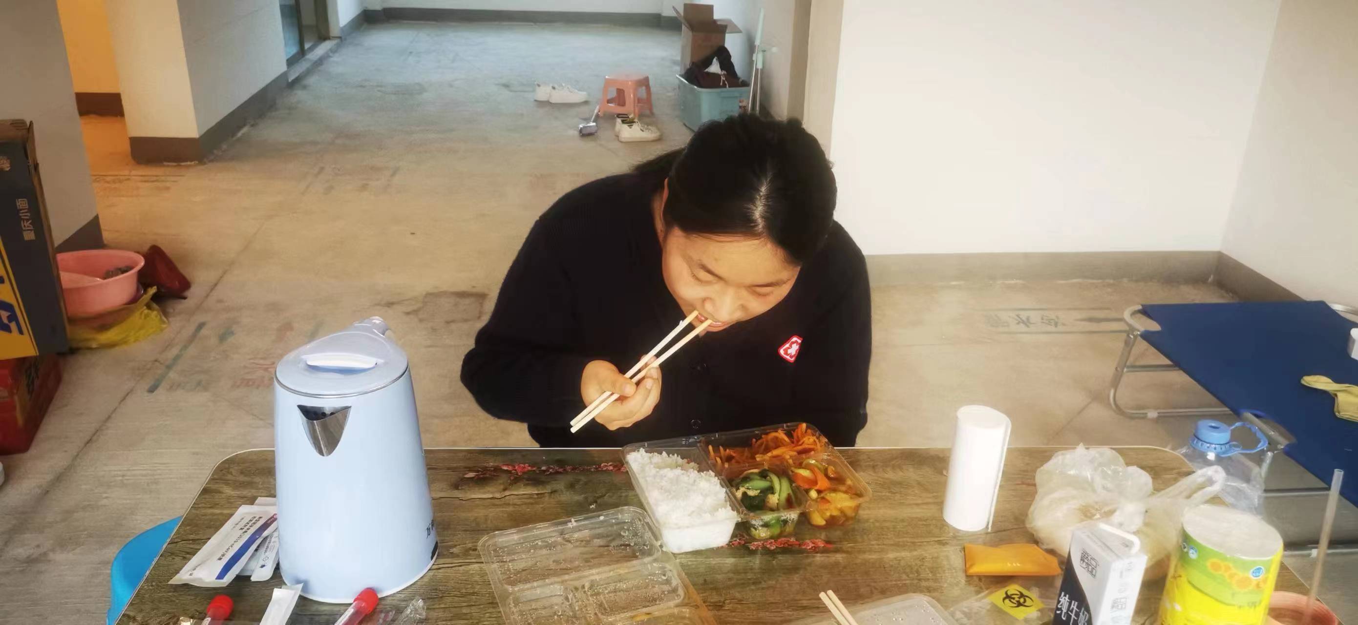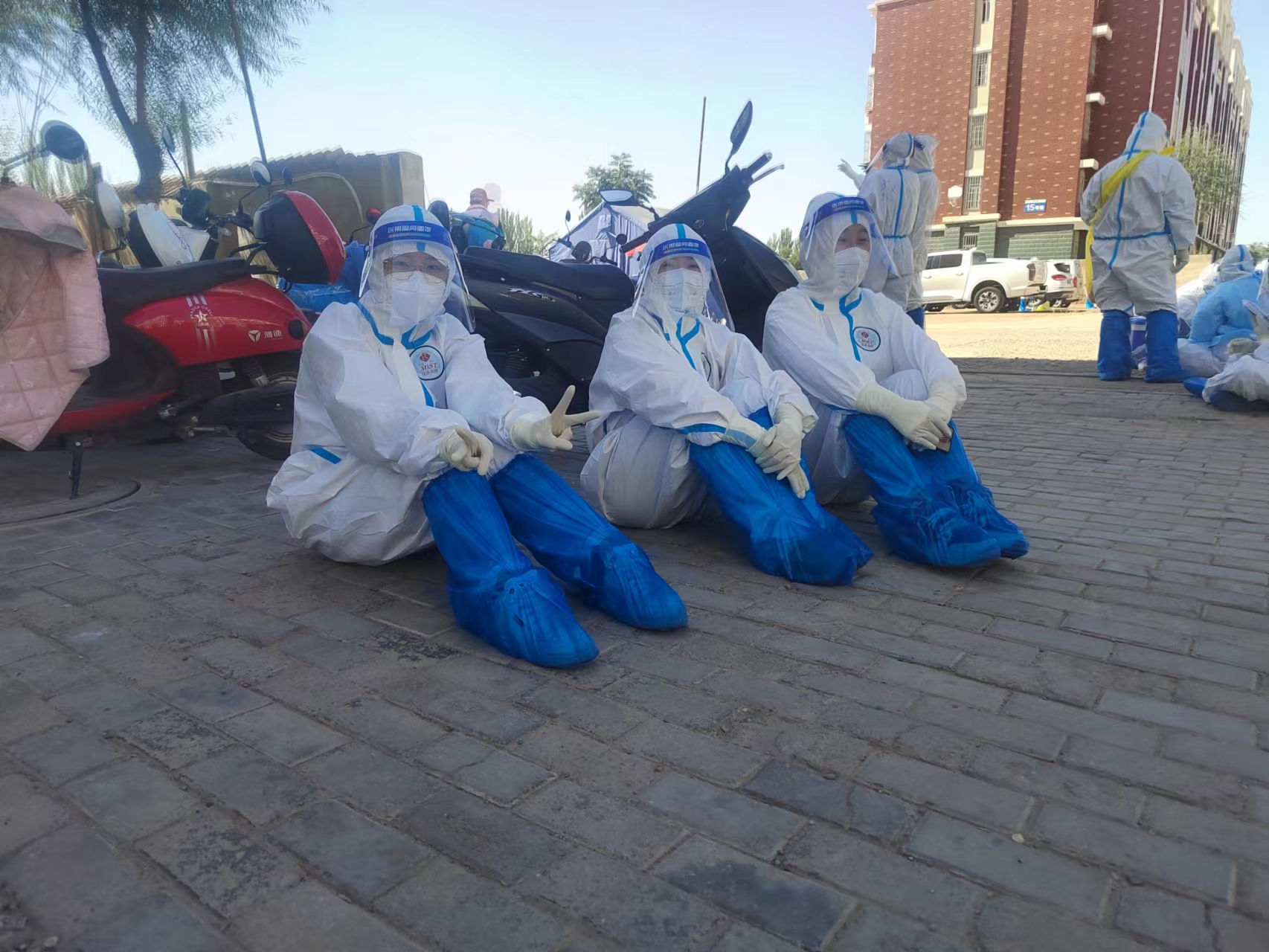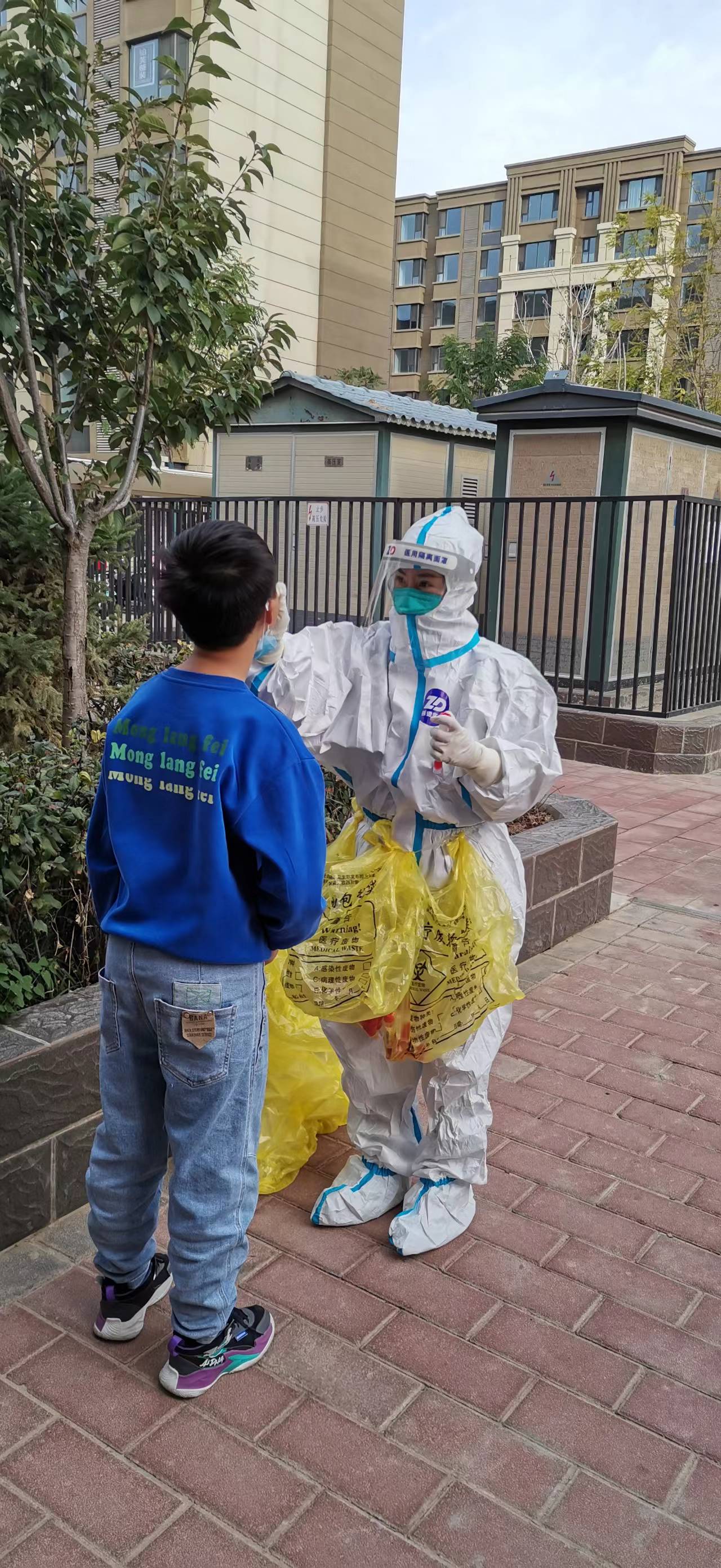 25日一早天刚亮,我们就赶到本次疫情暴发地,素有“中国枸杞之乡”美名的中宁县。我们一行10人的任务就是在高风险区入户上门采集核酸。由于当地条件限制,只能住在同心县,每天奔波在同心中宁两地,往返150多公里。四点多起床吃早餐,一早赶到中宁,在封控区挨家挨户,一个个上门采集核酸,当地住宅区都是步行楼梯,要一级台阶一级台阶步行上去,一个一个敲开单元门,扫码、采集核酸,再一步一步下楼,再上楼.....敲门,大家打趣我们从事的是“敲门行动”。为了轻装上阵,队员们不敢吃、不敢喝,加上高强度的工作量,不一会就又饿又渴,两条腿和灌了铅一样沉重,但大家都咬紧牙关,默默坚持。关键时刻,既冲得上去,也豁的出来,只为应检尽检,不漏一人。为节约时间,马路边、单车上、公交站、廊椅上,匆匆填饱肚子,只为了快速赶到下一站,在奋战的每一天,大地是餐桌,微风相伴时,沙尘做佐料,就这样每天奔波在封控区的各个小区,晚上回到住处往往已经是11点多,精疲力尽。由于各种原因,经常搬家,住过方舱、学生宿舍等。
