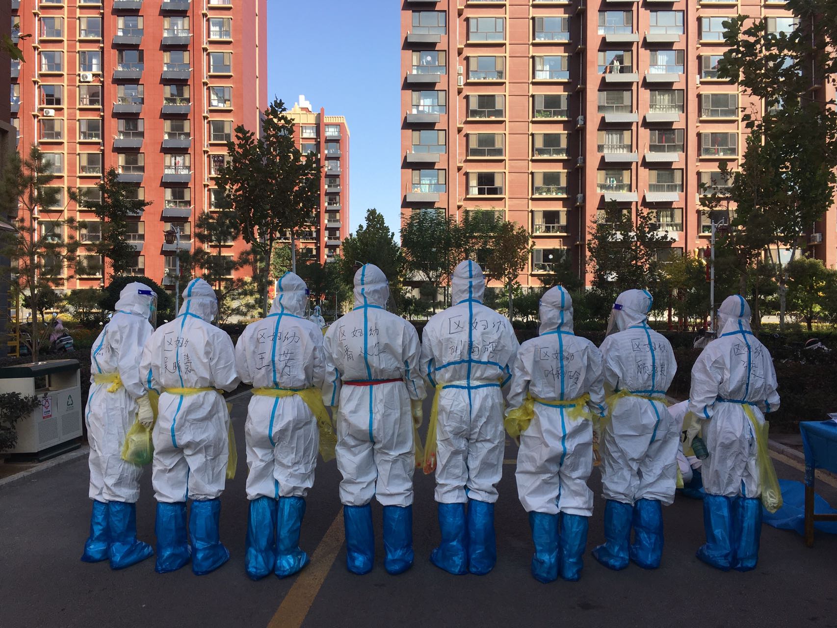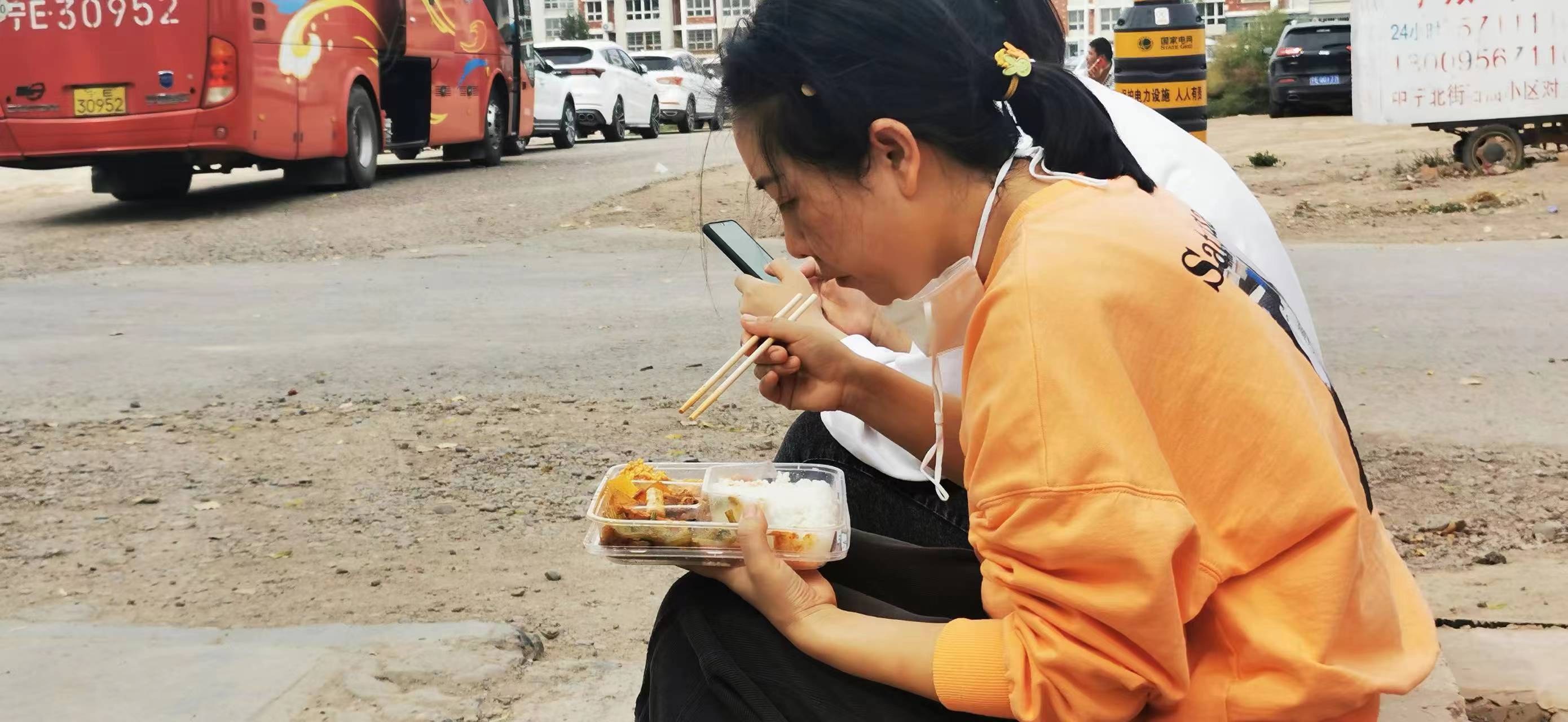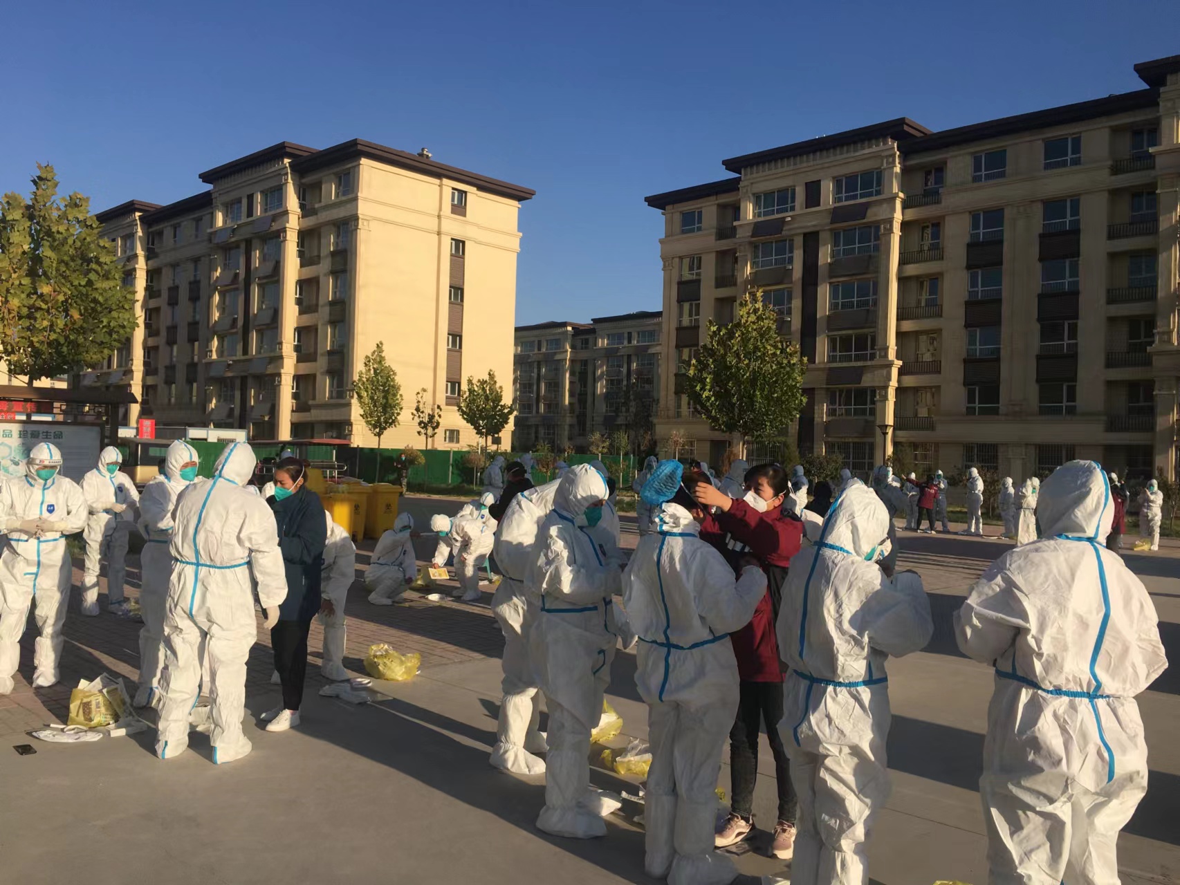 25日一早天刚亮,我们就赶到本次疫情暴发地,素有“中国枸杞之乡”美名的中宁县。我们一行10人的任务就是在高风险区入户上门采集核酸。由于当地条件限制,只能住在同心县,每天奔波在同心中宁两地,往返150多公里。四点多起床吃早餐,一早赶到中宁,在封控区挨家挨户,一个个上门采集核酸,当地住宅区都是步行楼梯,要一级台阶一级台阶步行上去,一个一个敲开单元门,扫码、采集核酸,再一步一步下楼,再上楼.....敲门,大家打趣我们从事的是“敲门行动”。为了轻装上阵,队员们不敢吃、不敢喝,加上高强度的工作量,不一会就又饿又渴,两条腿和灌了铅一样沉重,但大家都咬紧牙关,默默坚持。关键时刻,既冲得上去,也豁的出来,只为应检尽检,不漏一人。为节约时间,马路边、单车上、公交站、廊椅上,匆匆填饱肚子,只为了快速赶到下一站,在奋战的每一天,大地是餐桌,微风相伴时,沙尘做佐料,就这样每天奔波在封控区的各个小区,晚上回到住处往往已经是11点多,精疲力尽。由于各种原因,经常搬家,住过方舱、学生宿舍等。